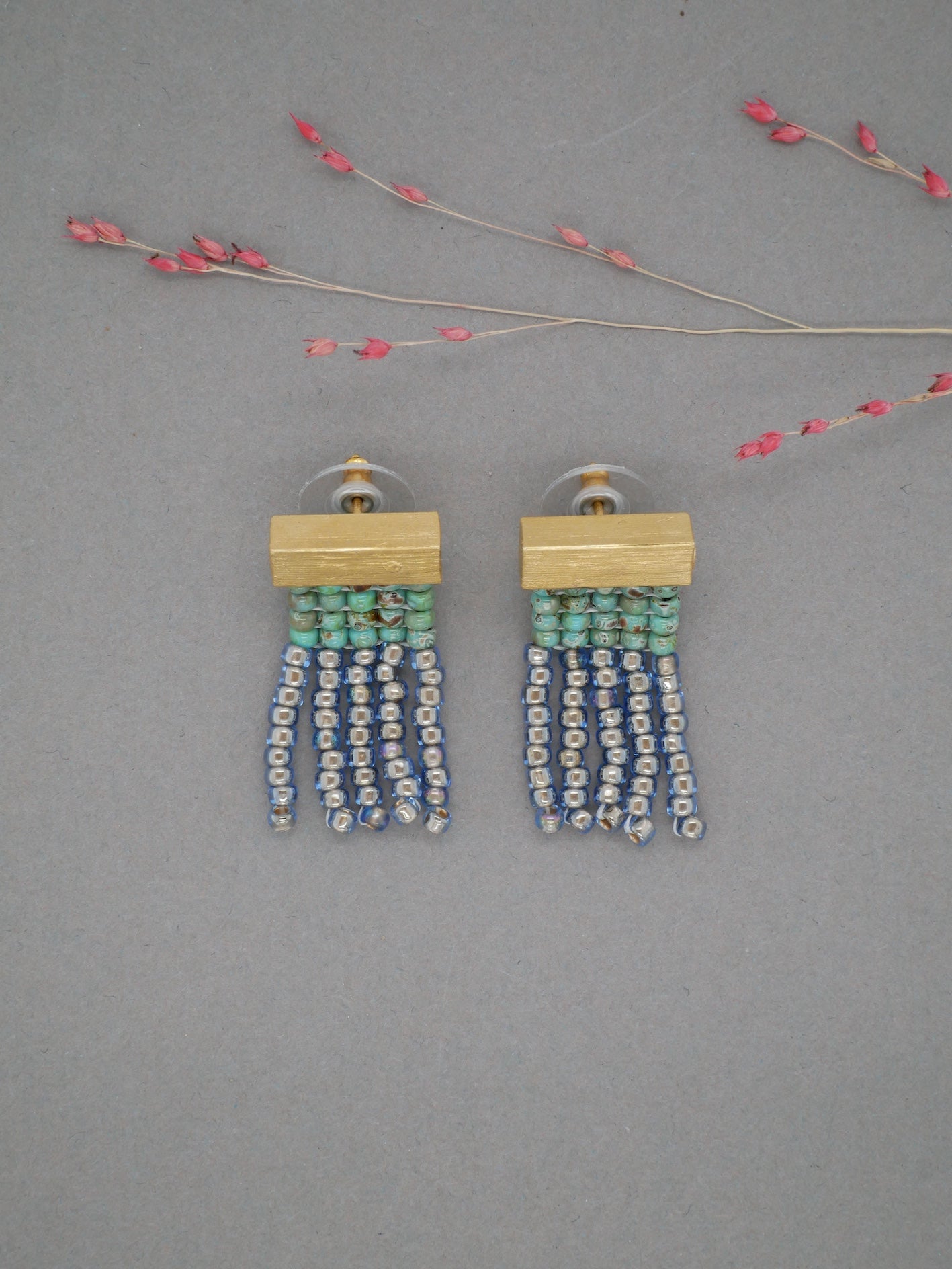 Der Fringe Ohrring besteht aus einer oberen verwebten Fläche, die sich nach unten hin in hängende Perlenreihen teilt. Das Model ist durch einen oberen Steg gefasst.